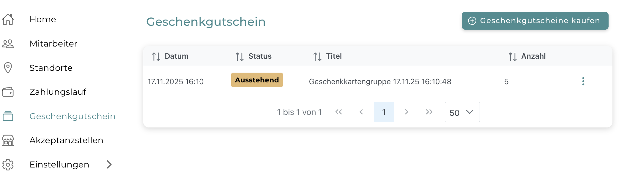 Nachdem Sie Ihren Kauf mit Klick auf "Gutscheine bestellen" abgeschlossen haben, erscheinen die Gutscheine zunächst mit dem Status "ausstehend", bis die Zahlung abgeschlossen ist.